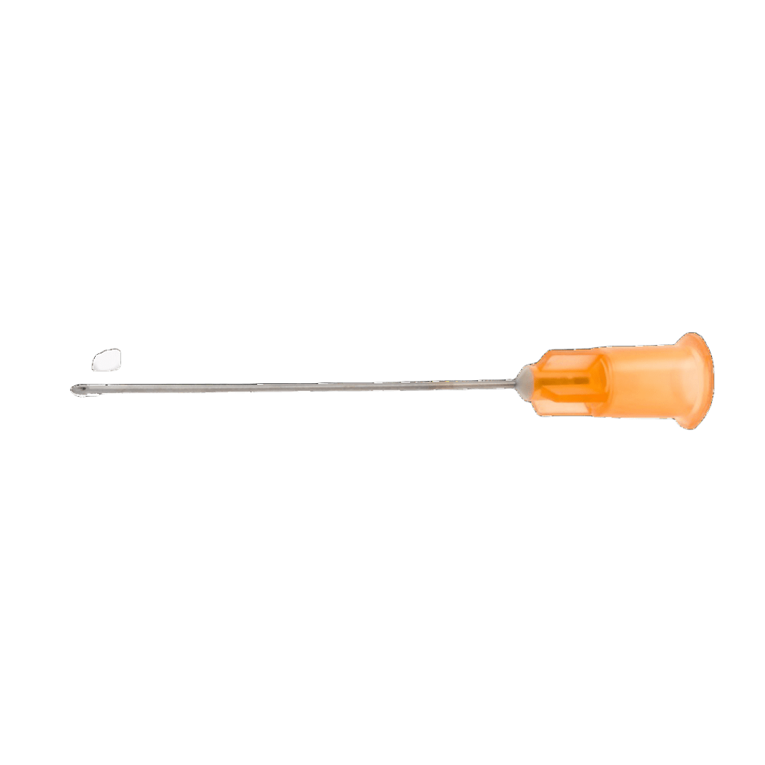 Aguja Retrobulbar Punta Atkinson 25G – Caja 10 uds Aguja de 0,5 × 38 mm para procedimientos oftálmicos. Punta Atkinson para anestesia retrobulbar. Cánula de acero inoxidable y centro de polipropileno.