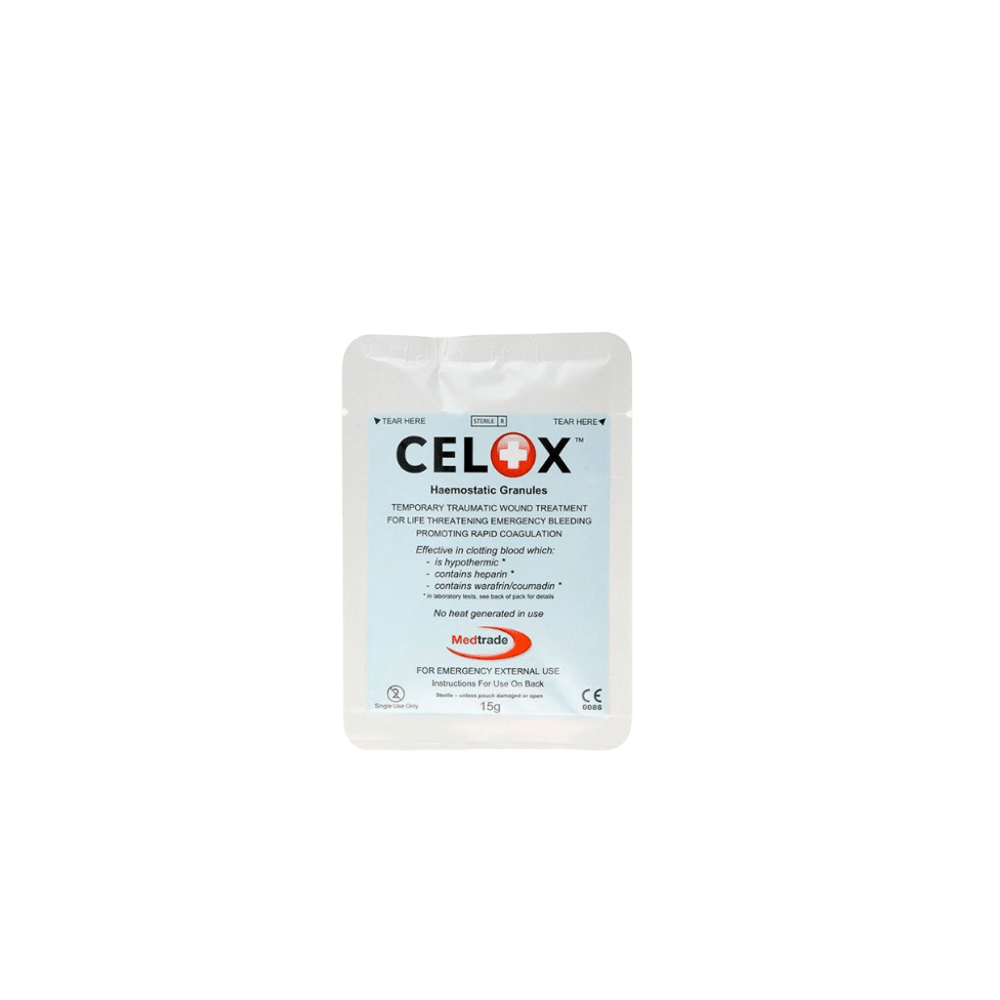 Apósito Hemostático CELOX Granular – 15 g Hemostático en polvo de alta eficacia para hemorragias severas. Coagula en 30 segundos, incluso en presencia de anticoagulantes o en condiciones hipotérmicas.