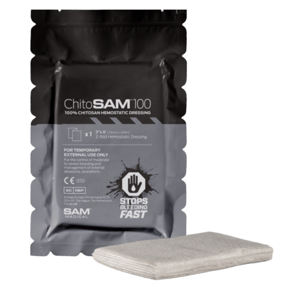 Apósito Hemostático ChitoSAM 100 – 10 x 10 cm Apósito estéril de acción rápida para controlar hemorragias. Eficaz en condiciones hipotérmicas y en pacientes anticoagulados. No contiene proteínas animales.