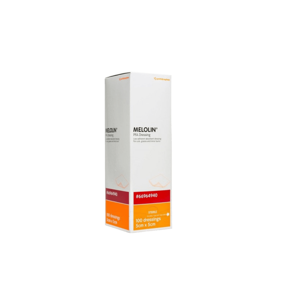 Apósito MELOLIN – Absorbente de Baja Adherencia Apósito no adherente con núcleo de algodón/poliéster y película perforada. Protege la herida, drena el exudado y minimiza el trauma al retirarlo. Fácil de cortar, cómodo y seguro para el paciente.