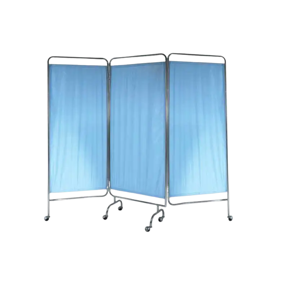 Biombo de acero inoxidable 3 cuerpos con ruedas – Privacidad y movilidad en entornos clínicos Biombo de tres cuerpos en acero inoxidable, fácil de desplazar gracias a sus ruedas.