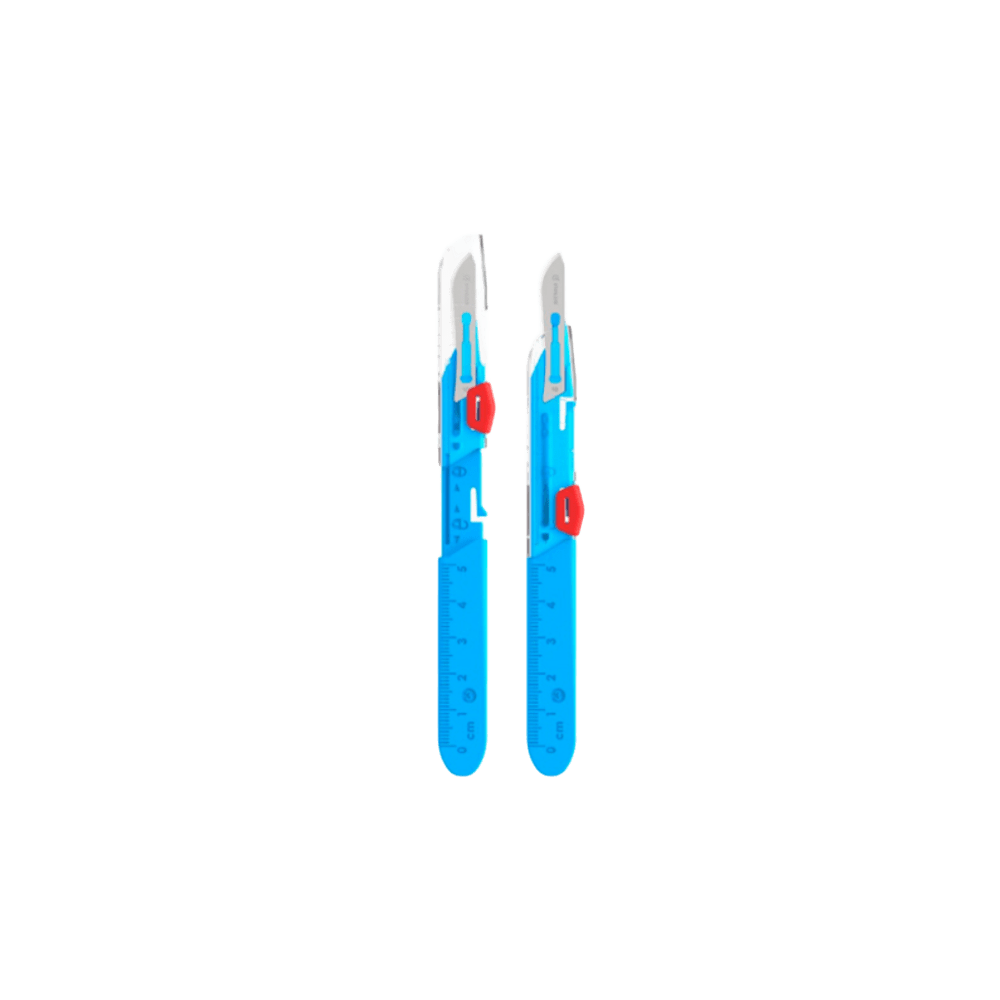 El bisturí de seguridad desechable “Razormed”, un instrumento quirúrgico de un solo uso diseñado específicamente para maximizar la seguridad en procedimientos médicos como cirugías generales y curaciones. Este dispositivo está compuesto por un mango ergonómico, una hoja afilada de alta calidad y una capucha de seguridad que protege al usuario de posibles accidentes por cortes o punciones involuntarias. El sistema de seguridad del bisturí incluye un indicador visual grabado que señala claramente el modo de uso (bloqueo/desbloqueo), junto con una alarma sonora que confirma la correcta activación de las diferentes posiciones: trabajo, reposo y bloqueo definitivo. Esta doble verificación (visual y auditiva) proporciona una mayor confianza al profesional sanitario durante su manipulación. La capucha de seguridad es transparente para permitir la visibilidad de la hoja y cuenta con laterales texturados que mejoran el control manual. Además, el botón deslizante, utilizado para mover la capucha, está codificado por colores para identificar rápidamente el tipo o modelo de hoja incorporada. El mango, fabricado en policarbonato resistente, presenta un diseño en color azul con indicadores grabados en forma de flechas que facilitan el posicionamiento correcto del instrumento. También incluye una escala métrica de 50 mm para dimensionar con precisión el área de incisión y un número de identificación de la hoja grabado en su reverso para una referencia rápida y segura. - Modo de empleo: › Elegir la hoja necesaria y extraer del envase individual manteniendo su esterilidad. › Para exponer la hoja, presionar el botón y deslizar la capucha hasta oír Click. Usar. › Para ocultar la hoja deslizar la capucha protectora hasta cubrirla y oír Click de nuevo. › Para bloqueo, desplazar ahora con más fuerza sobre la hoja hasta oír Click. - Beneficios: › Proporciona un medio seguro de manipulación favoreciendo una técnica con menor riesgo de accidente por objetos punzantes. › Presenta posibilidad de proteger la hoja temporalmente manteniendo la seguridad. › Mecanismo de retracción de fácil manejo. Uso intuitivo. Manejo ambidiestro. › Capucha protectora rugosa para mejor sujeción con los dedos. Minimiza el deslizamiento y permite un agarre firme. › Escala métrica que permite dimensionar la incisión. › Libre de ftalatos y libre de látex. .