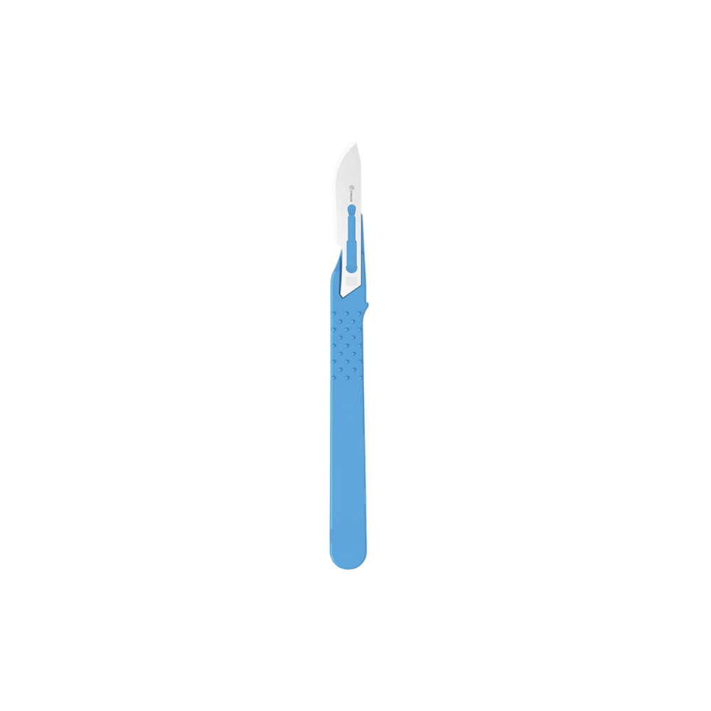 El bisturí desechable estéril está diseñado para uso profesional en procedimientos médicos que requieren cortes precisos y controlados sobre la piel del paciente. Este instrumento está compuesto por un mango, una hoja afilada y una capucha protectora que garantiza la seguridad durante su manipulación y almacenamiento. Viene ensamblado y preparado para su uso inmediato, lo que facilita su manejo en entornos clínicos y quirúrgicos. Además, cuenta con una variedad de números de hoja que permiten adaptarse a las necesidades específicas de diferentes intervenciones o tratamientos, asegurando versatilidad y precisión en cada procedimiento. - Características del Mango: El mango está elaborado con materiales ABS y polipropileno (PP), presenta un color azoláceo y cuenta con una escala métrica de 50 mm. Además, incluye una tapa protectora para mayor seguridad. - Características de la Hoja: La hoja está fabricada en acero al carbono y cumple con las especificaciones T10A. Está disponible en varios tamaños o números para adaptarse a diferentes necesidades. - Beneficios: › Material que ofrece mejor resistencia al paso del tiempo con unas condiciones óptimas del filo. Hoja de acero al carbono con el mejor acabado liso y sin rebabas › Hoja con numeración marcada para garantizar la elección correcta durante el uso. › Mango diseñado con rugosidades en zonas de agarre para facilitar el uso con guantes. › Escala métrica que permite dimensionar la incisión. › Envasado con capucha protectora para mayor seguridad. › Papel aluminizado protector con un dispositivo inhibidor de la corrosión para garantizar todas las propiedades de fabricación. › Solapas para una apertura fácil y controlada. Mejor manteniendo de las condiciones de esterilidad y volcado sobre campo estéril seguro. › Material atóxico y libre de látex .