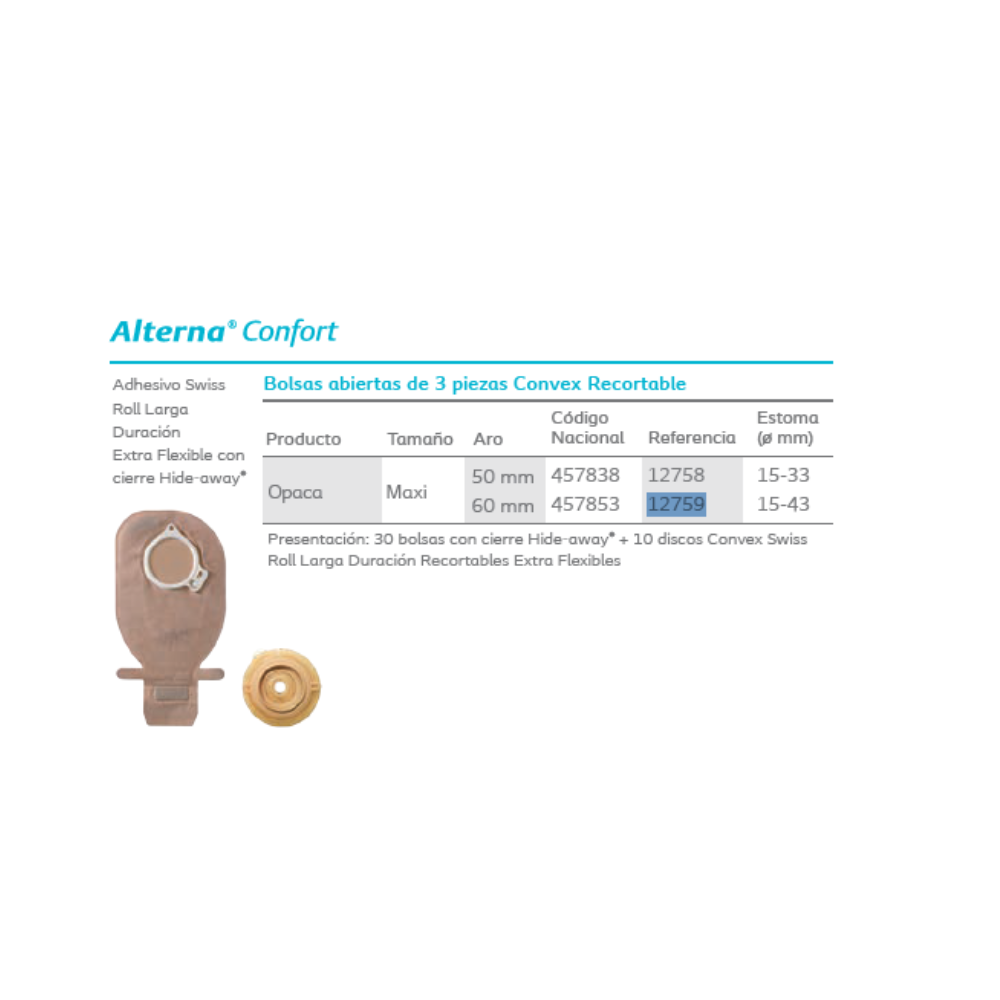 Bolsa Abierta Opaca con Aro de 3 Piezas – Extra Flexible con Cierre Hide-away La bolsa abierta opaca de 3 piezas con aro y cierre Hide-away está diseñada para brindar máxima seguridad, confort y discreción a usuarios de sistemas de ostomía. Su diseño extra flexible se adapta cómodamente al cuerpo, permitiendo mayor libertad de movimiento y confort prolongado. Cuenta con un sistema de acoplamiento de aro de 3 piezas que facilita una conexión segura con la base adhesiva (placa), permitiendo cambios rápidos sin comprometer la integridad del sistema. Su cierre Hide-away ofrece un sistema de vaciado discreto, higiénico y fácil de ocultar. Características principales: Sistema de 3 piezas con aro: facilita el acople y desacople sin necesidad de retirar la base adhesiva. Bolsa opaca: mayor discreción para el usuario. Extra flexible: se adapta mejor al cuerpo, brindando comodidad durante todo el día. Cierre Hide-away: permite un vaciado higiénico y discreto, fácil de usar y de ocultar. Diseño convexo (Convex): ideal para estomas retraídos o en pliegues de piel, mejora el ajuste y la seguridad. .