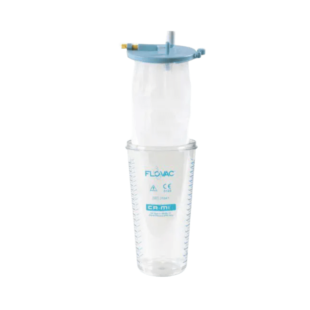 Bolsa desechable Flovac 2000 ml – Sistema seguro de recogida de fluidos Bolsa de aspiración con tapa, capacidad de 2000 ml. Desechable y estéril. Caja de 50 unidades.