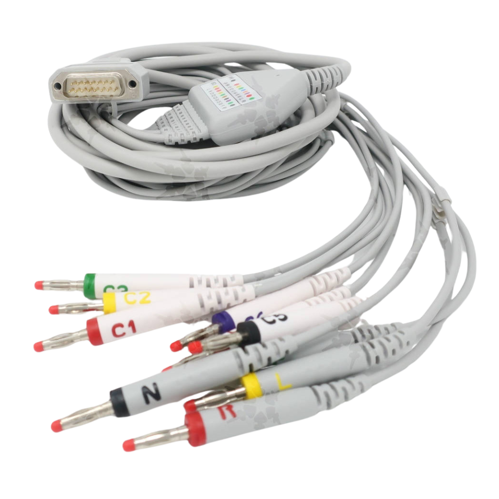 Cable Paciente ECG 10 Vías – Compatible MAC 400/500/800/1100/1200 Cable completo de 10 derivaciones con conector banana de 4 mm y sistema de 12 pines. Compatible con equipos GE Medical Systems® MAC.