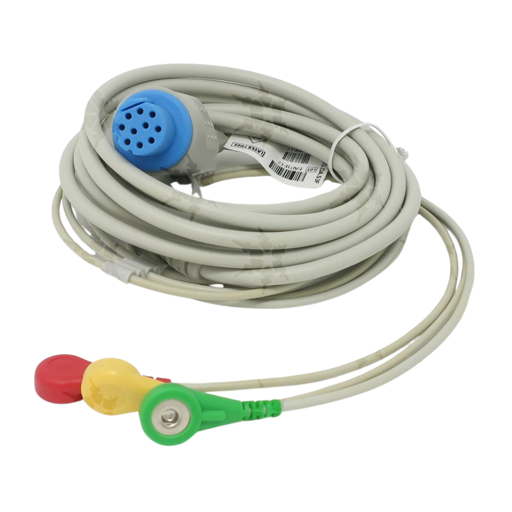 Cable ECG 3 Vías con Clip – Compatible Datex/CardioAid Cable de ECG de 3 derivaciones con terminación tipo clip. Compatible con monitores GE Datex Ohmeda (AS/3, S/5, Cardiocap) y CardioAid. Conector de electrodo 4 mm Ø.