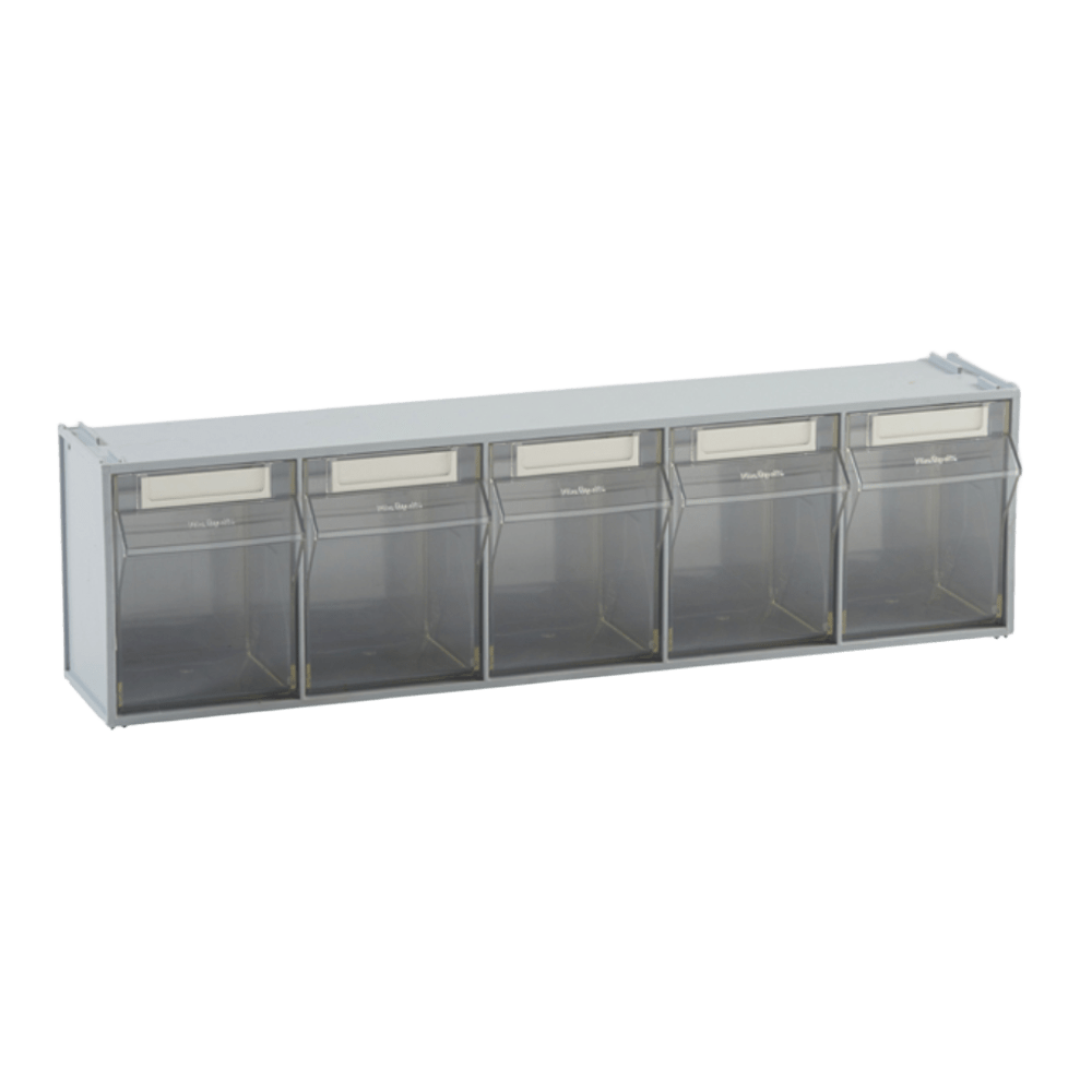 Cajonera Apilable con 9 Cajones Basculantes Cajonera de plástico con 9 cajones basculantes. Ideal para clasificar y organizar pequeños materiales. Medidas de cada contenedor: 600 × 51 × 77 mm.
