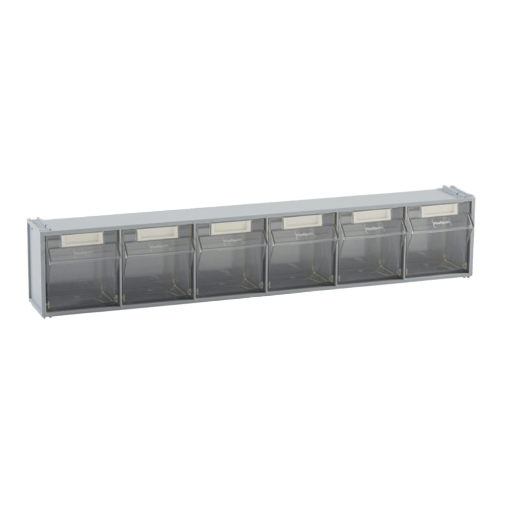 Cajonera Apilable con 6 Cajones Basculantes Cajonera de plástico con 6 cajones basculantes. Ideal para clasificar y organizar pequeños materiales. Medidas de cada contenedor: 600 x 91 x 112mm.