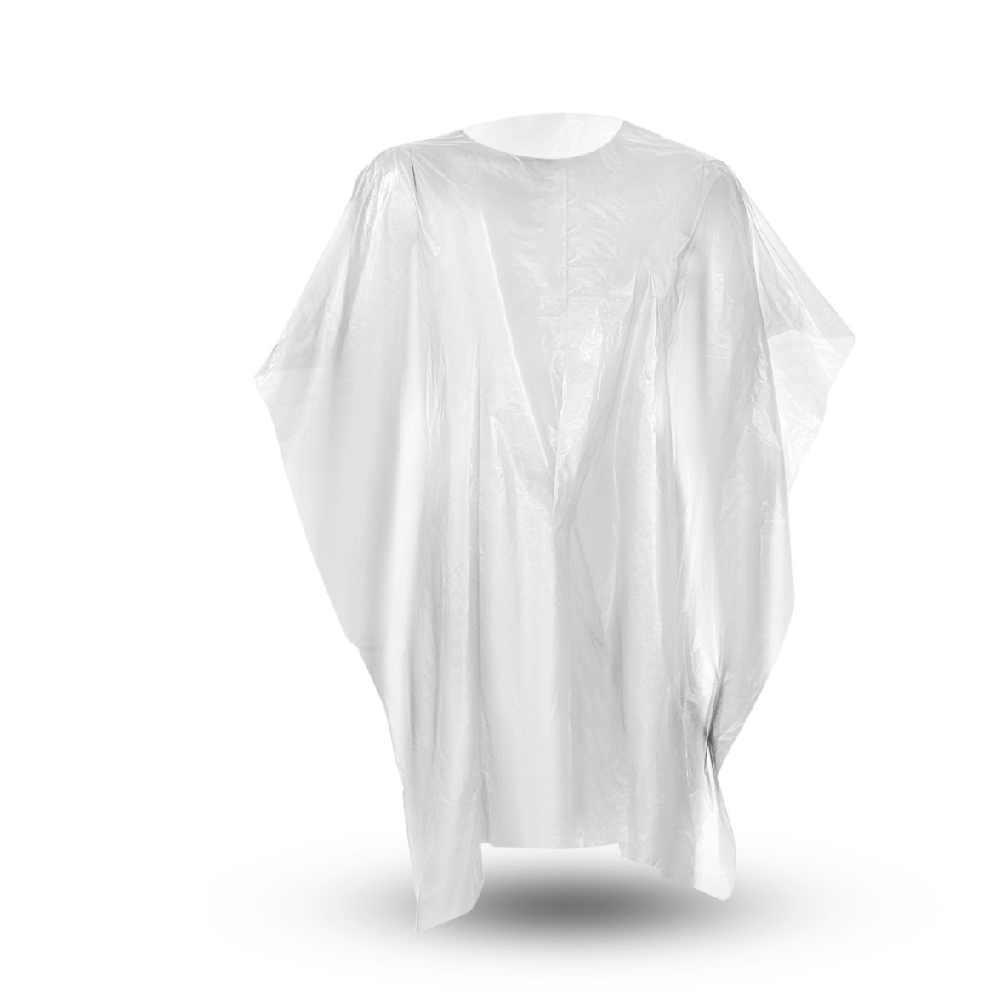 Capa desechable fabricada en polietileno, ideal para proteger la ropa durante tintes y cortes de cabello. Impermeable, ligera y fácil de colocar. Ofrece cobertura amplia y comodidad en peluquerías y salones de belleza. Caja de 50 unidades. Uso único, práctica e higiénica