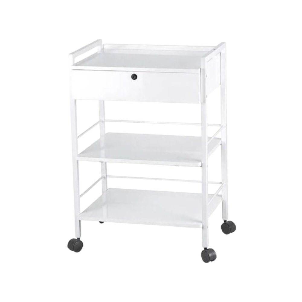 Carrito metálico con cajón y estantes – Almacenamiento seguro y desplazamiento cómodo Este carrito de estructura metálica blanca es la solución ideal para organizar equipos y accesorios en centros de belleza, estética, clínicas o entornos profesionales que requieren movilidad y orden en su espacio de trabajo. Cuenta con un práctico cajón con llave que permite almacenar material de forma segura y protegida, y tres estantes amplios diseñados para colocar equipos de sobremesa o disponer de accesorios de uso frecuente. Su estructura compacta permite optimizar el espacio sin renunciar a la capacidad de almacenamiento. Equipado con 4 ruedas giratorias, ofrece una movilidad total, facilitando el traslado del carrito según las necesidades del profesional. Su diseño funcional, resistente y de fácil limpieza lo convierte en un complemento práctico y duradero para cualquier entorno profesional. Características destacadas: • Carrito de estructura metálica color blanco • 1 cajón con llave para almacenamiento seguro • 3 estantes amplios para equipos y accesorios • 4 ruedas giratorias para máxima movilidad • Ideal para centros de estética, belleza, clínicas y consultas • Diseño compacto, resistente y fácil de limpiar • Medidas: 77 x 47,5 x 26,5 cm .