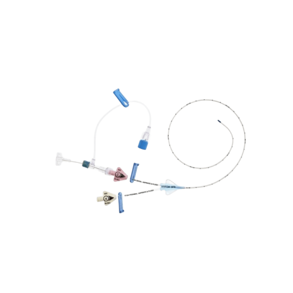 PICC 2 Vías 5Fr 55 cm Arrow – Set Básico, Caja 5 Unidades Catéter central de inserción periférica con punta BlueFlexTip y sistema de seguridad. Para inyección a presión, medición venosa y tratamientos prolongados. Incluye guía, introductores y accesorios.