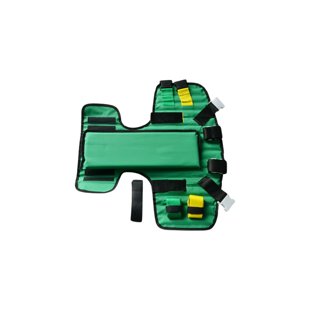 Chaleco inmovilizador de columna pediátrico – Seguridad y sujeción en espacios reducidos Permite una inmovilización segura en posición horizontal o vertical, con cinturones codificados por colores y bolsa de transporte incluida.
