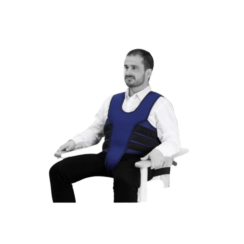 Chaleco Salvaclip Safe con banda perineal. Peto Safe con perineal sujeta al paciente de forma segura y cómoda, permitiendo libertad de movimiento y evitando deslizamientos.