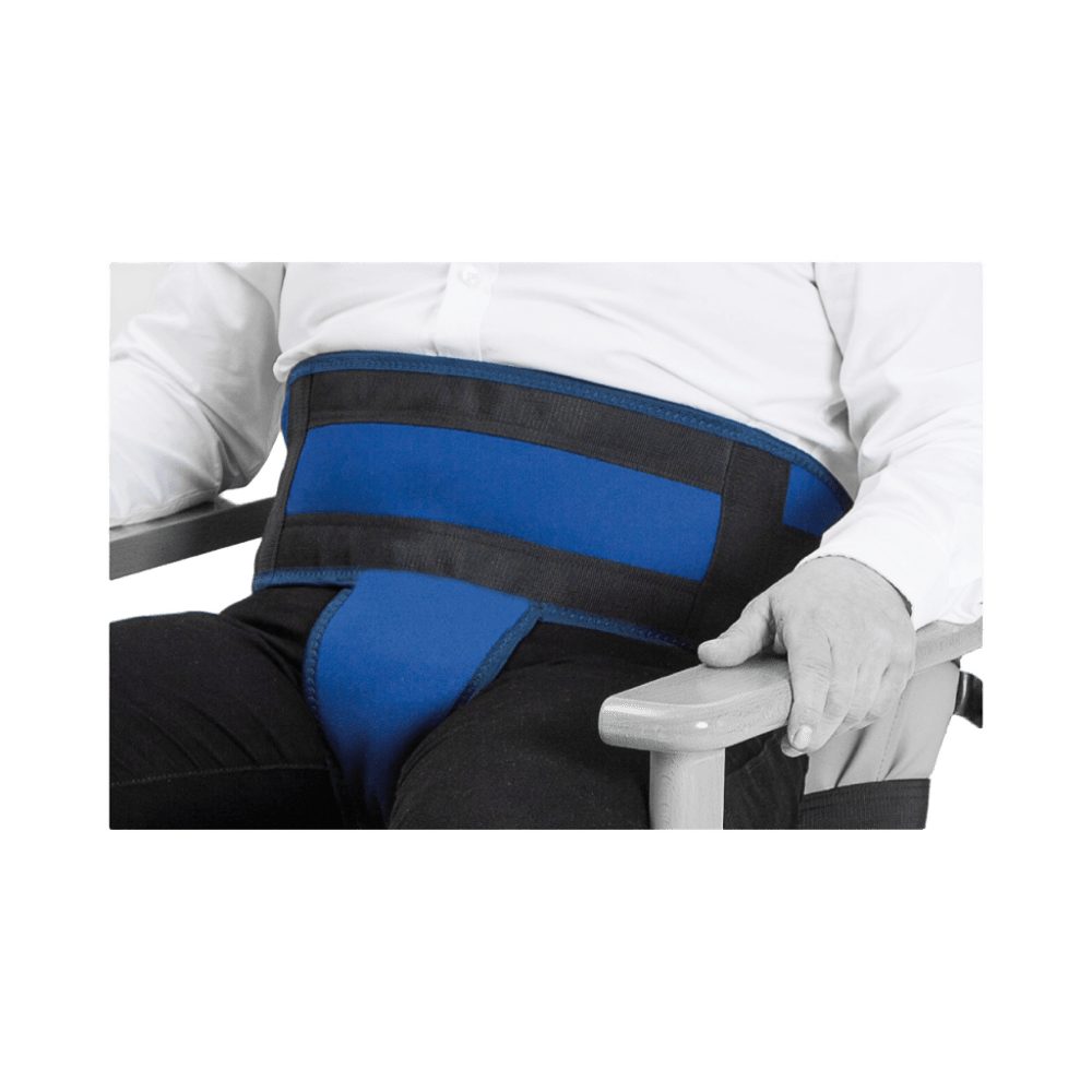 Cinturón Salvaclip Safe para butaca con banda perineal. Cinturón perineal para silla de ruedas que sujeta de forma segura al paciente, evitando desplazamientos hacia adelante sin limitar el movimiento de brazos y piernas.v