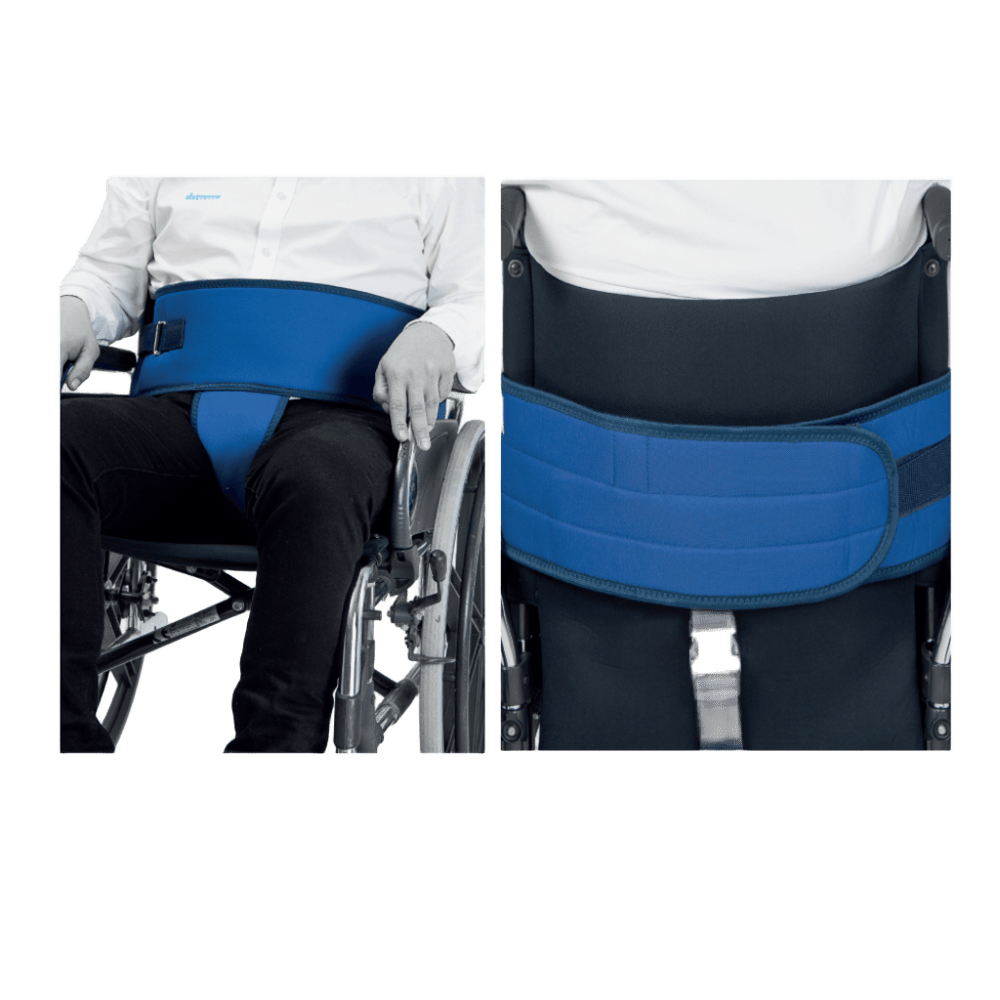 Cinturón velcro con banda perineal. Cinturón perineal con velcro para silla de ruedas, que asegura al paciente de forma firme y cómoda, con ajuste fácil y seguro.