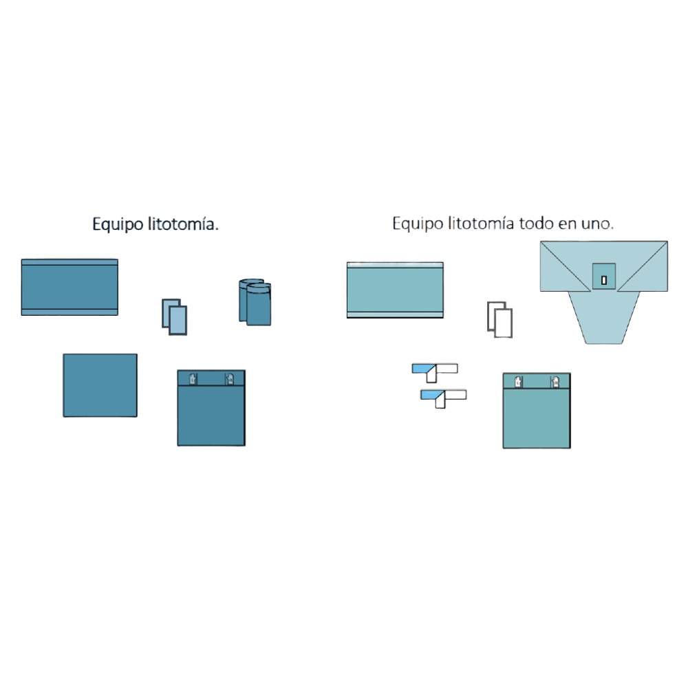 Equipo quirúrgico vía litotomía, uso principal en procedimientos quirúrgicos, fabricado en material bicapa estéril y libre de látex y DEHP.
