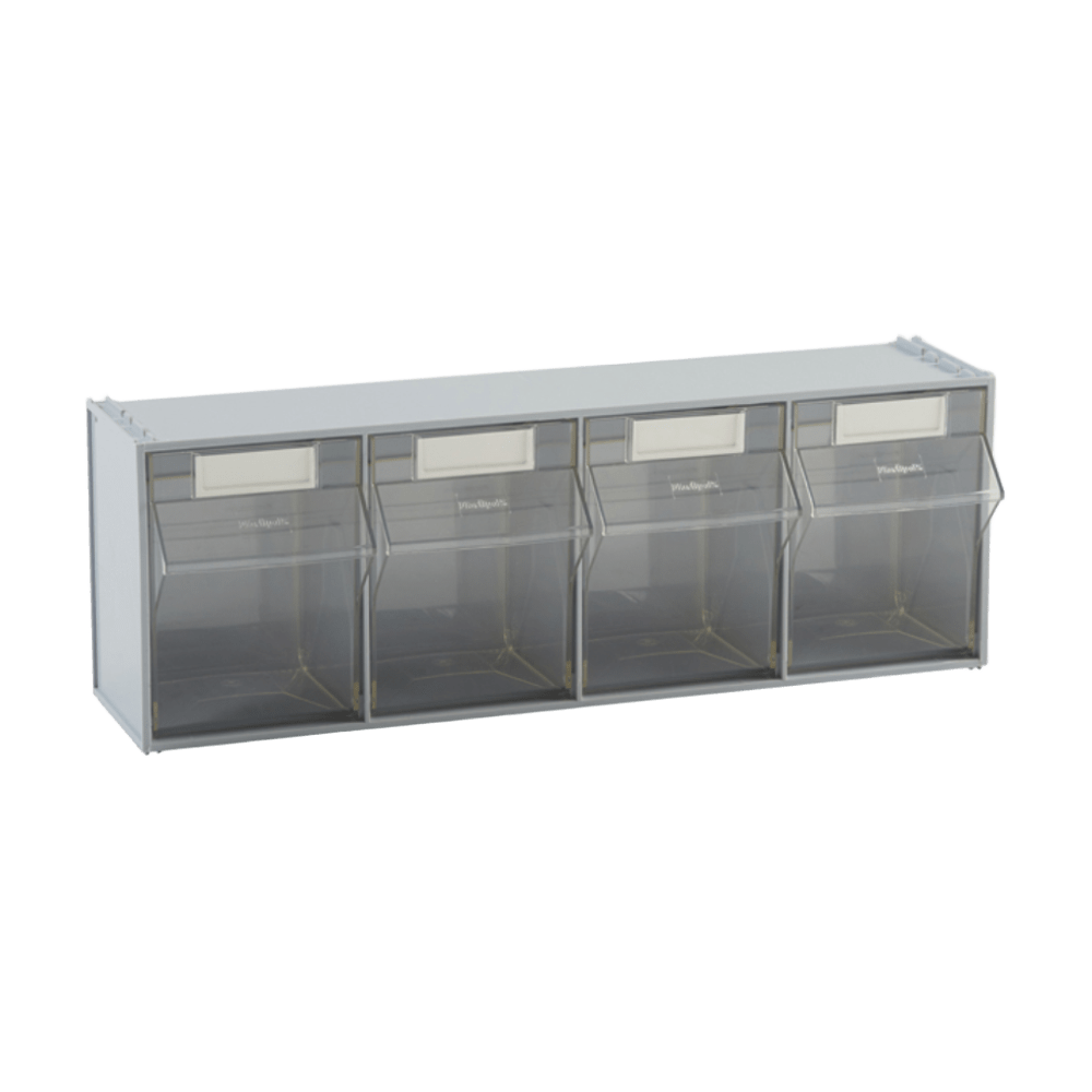 Contenedor Basculante de Plástico – 4 Cajones Contenedor organizador con 4 cajones basculantes. Fabricado en plástico resistente. Ideal para almacenar y clasificar material. Medidas: 600 × 170 × 206 mm.