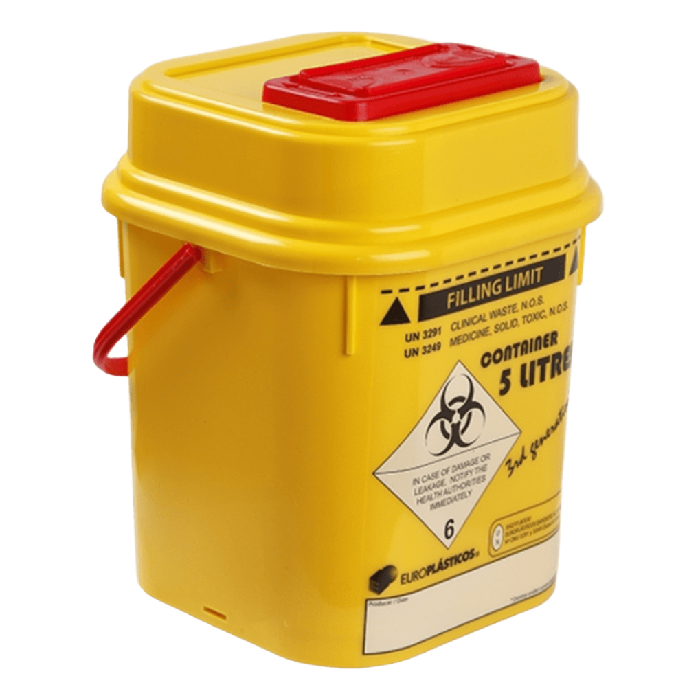 CONTENEDOR OBJETOS PUNZANTES CUADRADO 5 LITROS - UNIDAD Contenedor cuadrado para objetos punzantes y cortantes. Fabricado en plástico rígido y resistente, garantiza la seguridad en la eliminación de material sanitario contaminado.