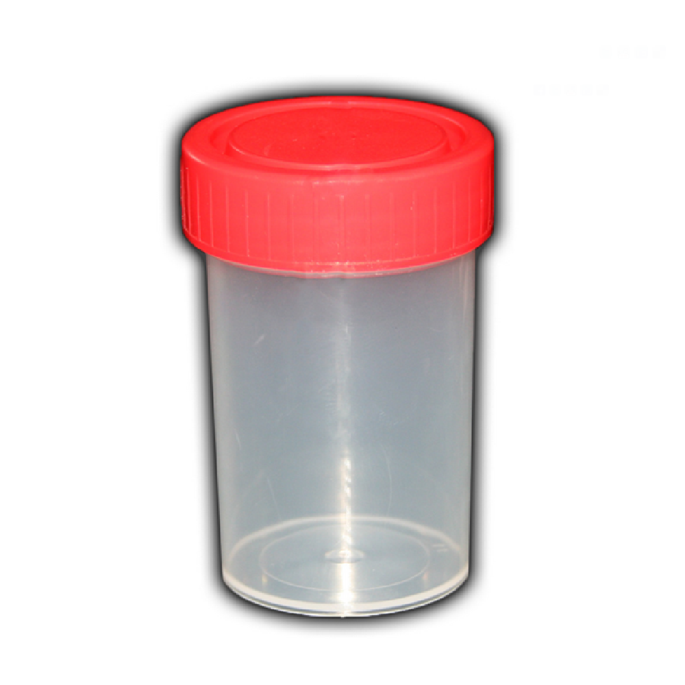 Colector de orina 120 ml para análisis clínico, con tapa roja de cierre hermético y cuerpo transparente graduado