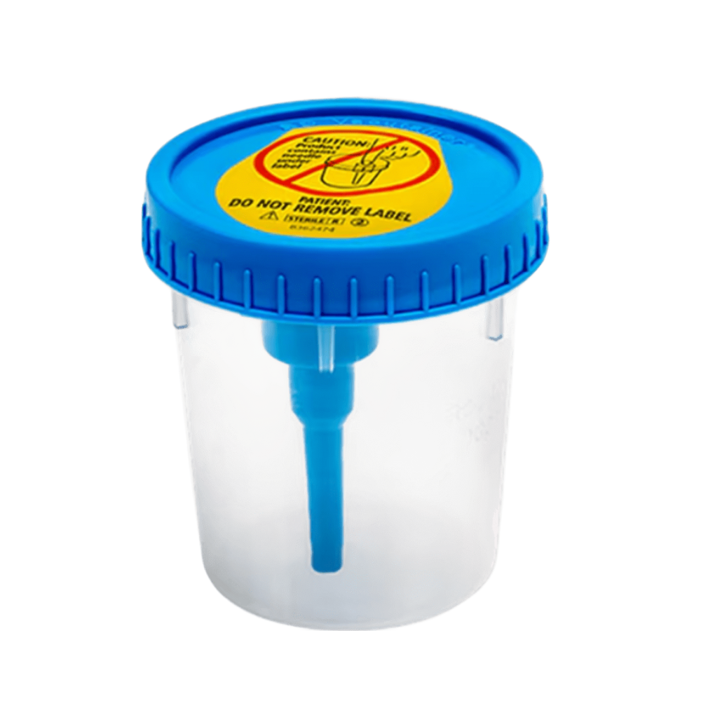 Contenedor Orina 120 ml con Dispositivo de Transferencia – Caja de 200 uds Recipiente para muestra de orina con tapa de rosca azul y sistema integrado para transferencia a tubo BD Vacutainer.