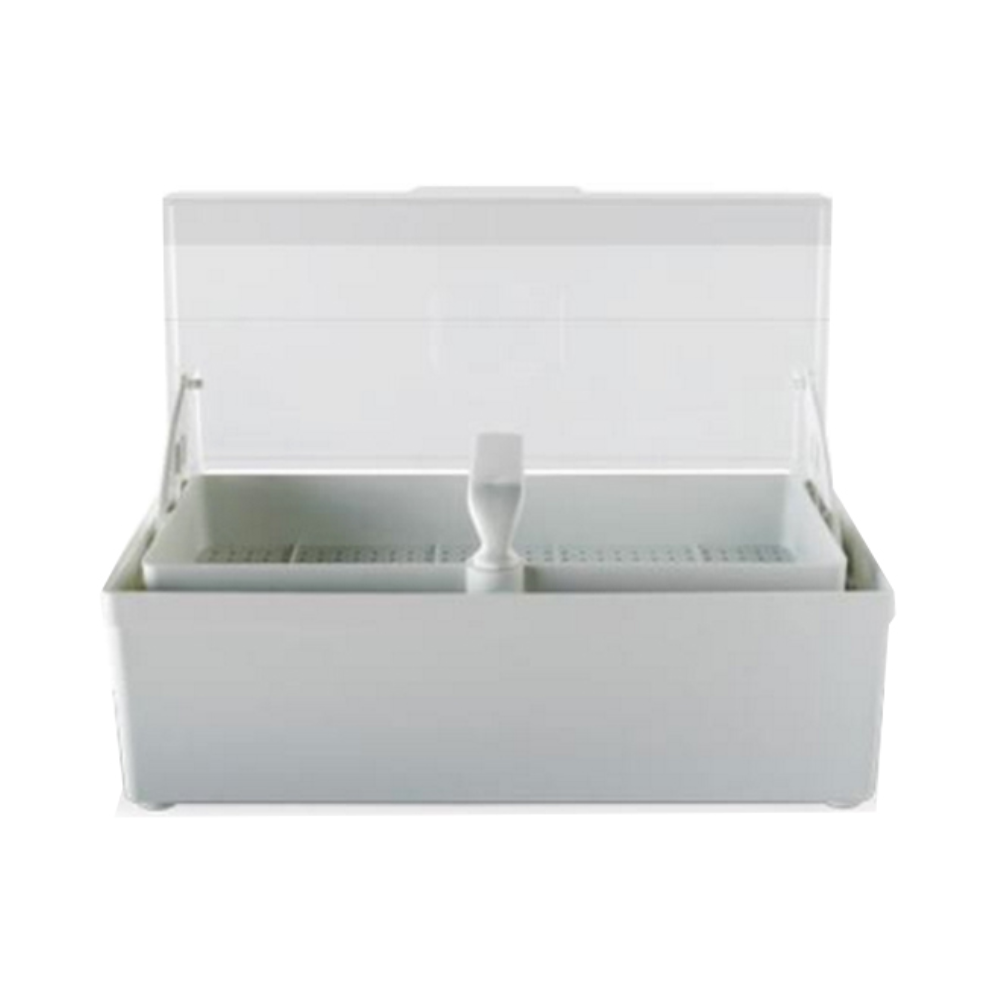 Cubeta con Tapa 1,5 L – Limpieza y desinfección por inmersión Recipiente rectangular con tapa y bandeja interior perforada, ideal para procesos manuales de desinfección por inmersión de instrumentos en soluciones químicas.