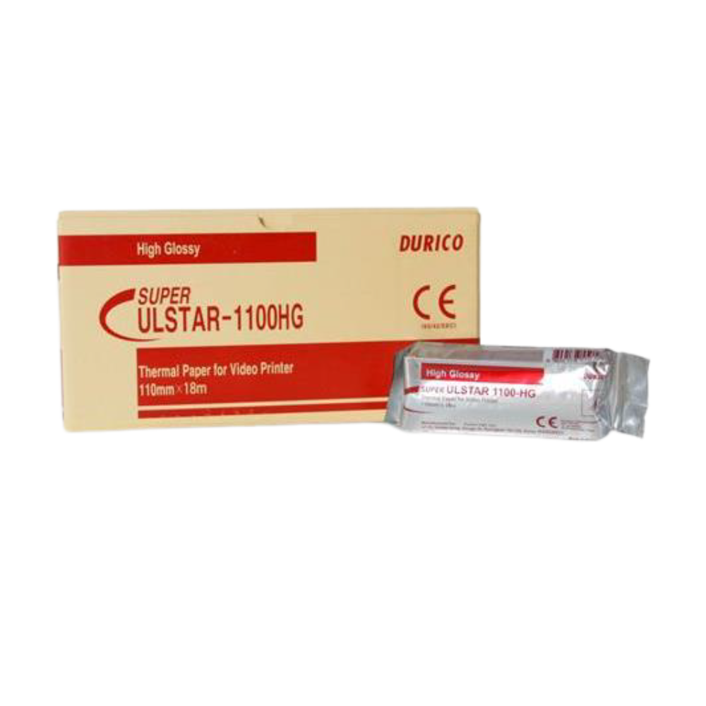 Papel para Ecógrafo ULSTAR 110-HG – Alta Densidad con Acabado Brillante Rollo de papel térmico blanco con acabado brillante, ideal para impresoras de ecografía blanco y negro. Ofrece imágenes de alta calidad y nitidez superior.