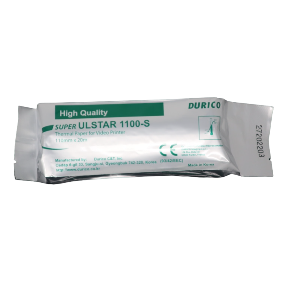 Papel Térmico para Ecógrafo ULSTAR-1100S – 110 mm x 20 m Rollo de papel térmico blanco de alta calidad, compatible con ecógrafos ULSTAR-1100S. Ideal para impresiones claras de imágenes diagnósticas.