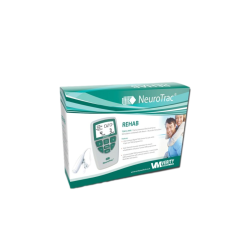 NeuroTrac Rehab TENS – Dispositivo TENS y NMES para rehabilitación funcional con control remoto El NeuroTrac Rehab TENS es un electroestimulador doble canal, diseñado para ofrecer terapias combinadas de estimulación nerviosa (TENS) y estimulación muscular (NMES). Está indicado para rehabilitación, alivio del dolor y reeducación neuromuscular, tanto en clínicas como en el entorno domiciliario. Cuenta con 10 programas TENS preestablecidos, 10 programas NMES, 2 programas TENS personalizables y 1 programa STIM remoto configurable. Incorpora un control remoto con cable, que permite al paciente activar la estimulación de forma sincronizada con el ejercicio, lo que optimiza la reeducación neuromuscular. Incluye funciones avanzadas como modo de bloqueo (para seguimiento de adherencia), pantalla LCD retroiluminada de alta visibilidad, y teclado con botones grandes para un manejo más sencillo. Todo en un equipo ligero, fiable y fácil de transportar. Características destacadas: • TENS y NMES – doble canal • 10 programas TENS y 10 programas NMES preestablecidos • 2 programas TENS y 1 STIM personalizable • Control remoto con interruptor de activación por paciente • Modo bloqueo con registro de uso (tiempo e intensidad) • Pantalla LCD retroiluminada – uso fácil en baja luz • Teclas grandes y diseño intuitivo • Portátil, compacto y confiable – ideal para fisioterapia y rehabilitación