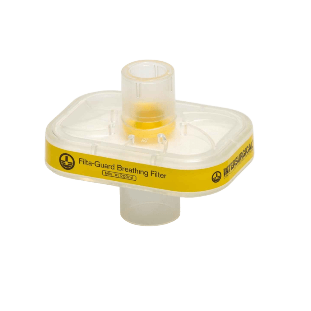 Filtro Respiratorio “Filta-Guard” – Protección eficiente y segura Filtro bidireccional de un solo uso con matriz hidrofóbica electrostática, sistema antioclusión, estrías “Turbo Web” y carcasa transparente. Conexiones estándar 22F-22M/15F.
