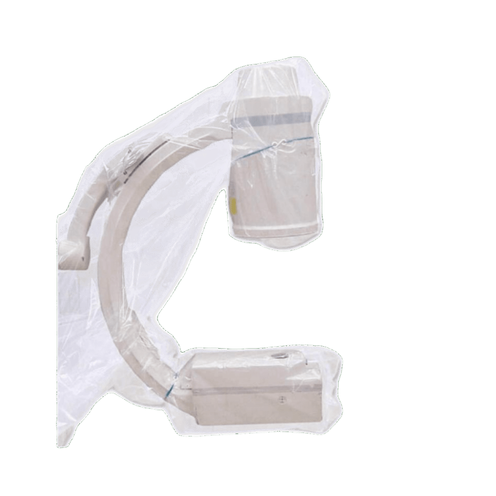 Invisishield™ – Funda de Arco en C Mini Funda estéril de polietileno transparente con bandas elásticas y cintas adhesivas, diseñada para cubrir arcos en C mini durante procedimientos quirúrgicos, garantizando protección estéril y visibilidad total.