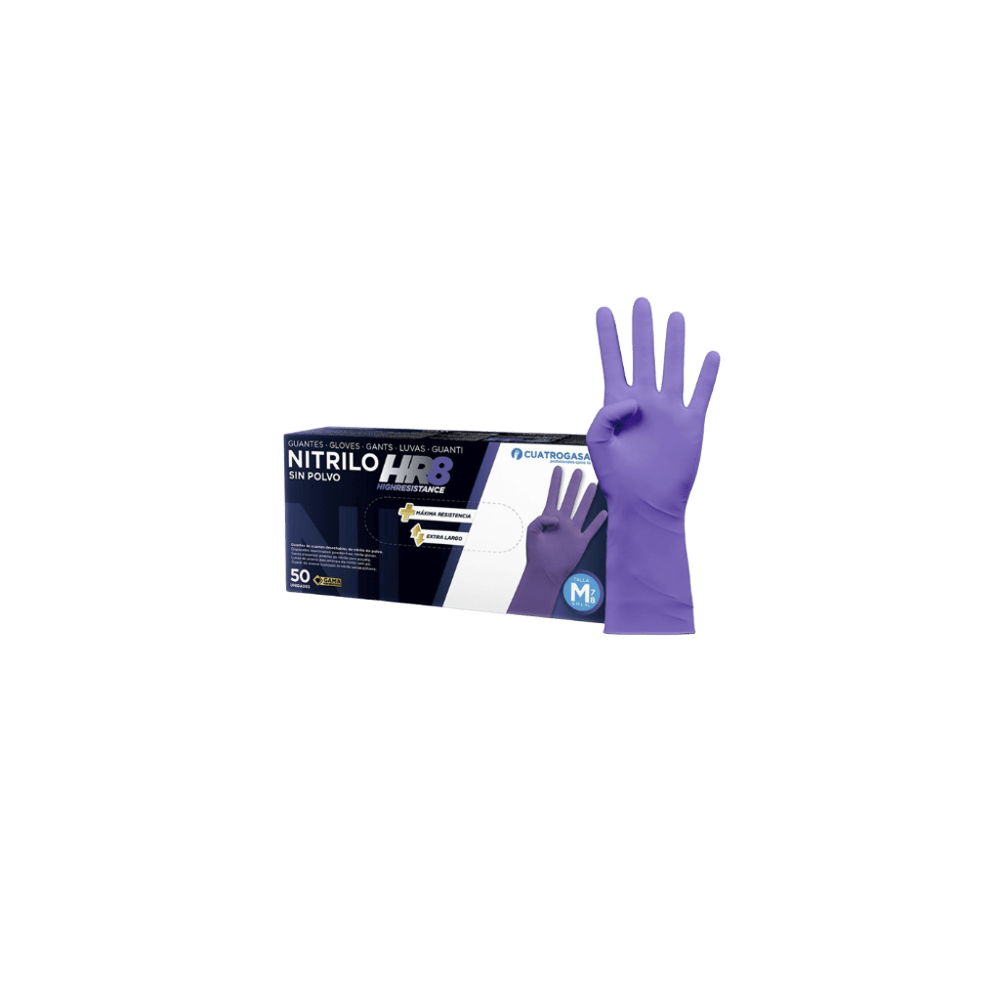 Guante Nitrilo Sin Polvo HR 8 Guante desechable de nitrilo morado, de alta resistencia y sin polvo, ideal para entornos de alto riesgo.