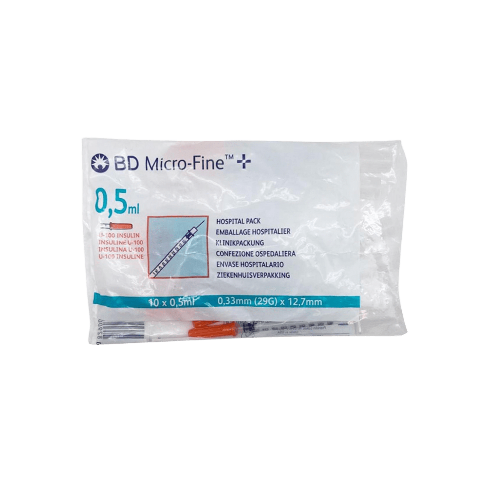 BD Micro-Fine™ + – Jeringas de Insulina de Alta Precisión para el Cuidado de la Diabetes Las jeringas de insulina BD Micro-Fine™ + están especialmente diseñadas para garantizar una administración subcutánea uniforme, precisa y cómoda de insulina en pacientes con diabetes mellitus. Incorporan tecnología avanzada de aguja BD que mejora la experiencia del usuario al reducir el dolor y optimizar la seguridad en cada inyección. Estas jeringas están calibradas para insulina U-100 y se ofrecen en varios volúmenes y configuraciones de aguja, adaptándose así a diferentes necesidades clínicas y preferencias del paciente: • BD Micro-Fine™ + 0,3 ml o Aguja: 0,30 mm (30G) x 8 mm o Graduación: de ½ en ½ unidad o Ideal para pequeñas dosis y máxima precisión • BD Micro-Fine™ + 0,5 ml (30G) o Aguja: 0,30 mm (30G) x 8 mm o Graduación: de 1 en 1 unidad • BD Micro-Fine™ + 0,5 ml (29G) o Aguja: 0,33 mm (29G) x 12,7 mm o Graduación: de 1 en 1 unidad • BD Micro-Fine™ + 1 ml o Aguja: 0,33 mm (29G) x 12,7 mm o Graduación: de 2 en 2 unidades Características destacadas: • Diseñadas para inyecciones subcutáneas de insulina U-100 • Tecnología BD que garantiza una punción suave y precisa • Varias graduaciones y calibres para diferentes dosis y tipos de pacientes • Agujas estériles y de un solo uso • Adaptadas a tratamientos crónicos con alto nivel de seguridad y fiabilidad .