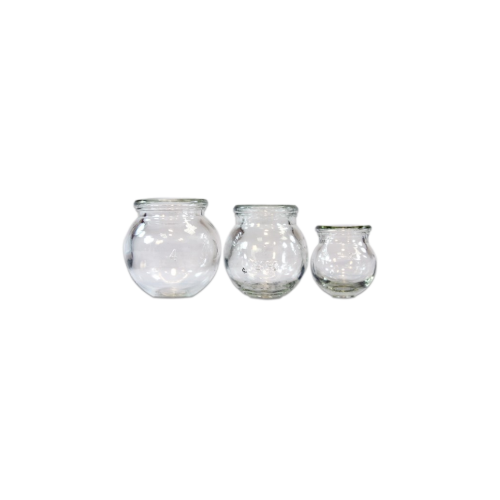 Kit de ventosas de cristal (3 unidades) ideal para terapias de succión, masaje y relajación muscular. Fabricadas en vidrio resistente, ofrecen una aplicación segura y efectiva para uso profesional o doméstico.