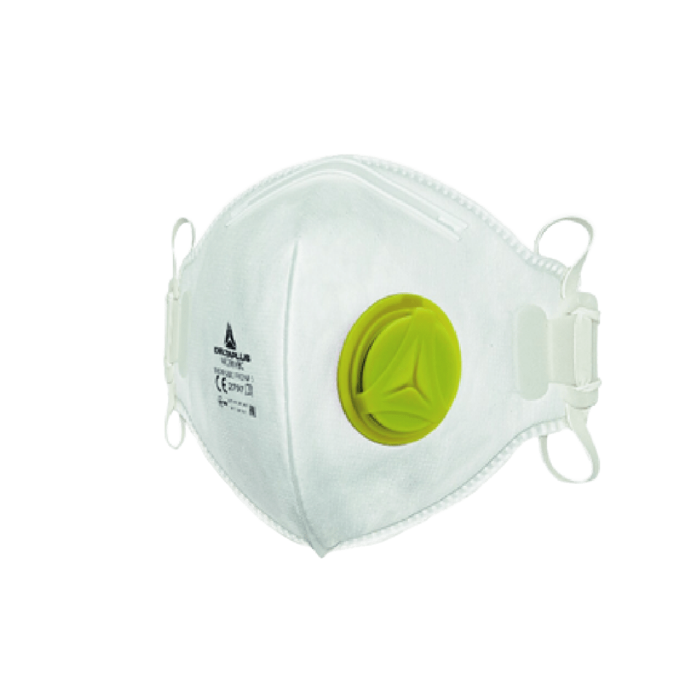 Mascarilla Respiratoria Desechable P2 con Válvula Mascarilla P2 plegable con válvula de exhalación, puente nasal ajustable y cierre posterior. Presentación individual para mayor higiene.