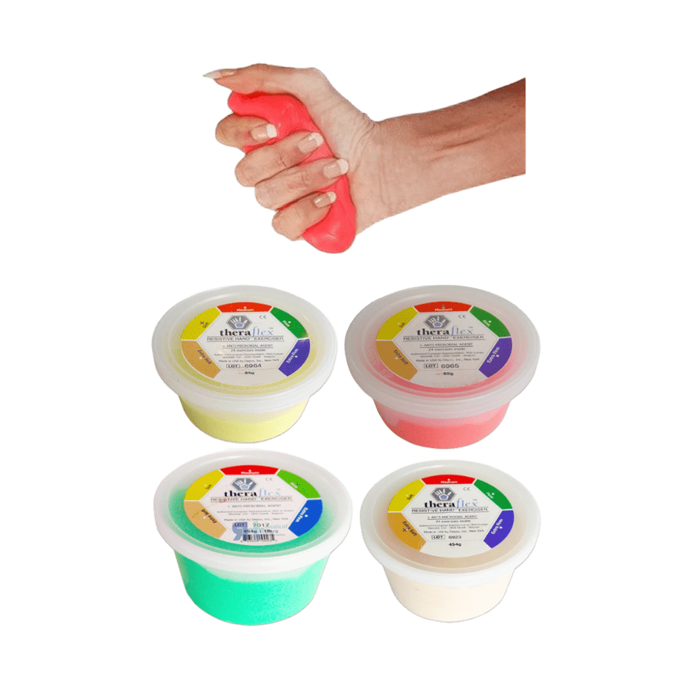 THERAFLEX – Masilla de Rehabilitación Moves Comfort Putty Masilla terapéutica para fortalecer la fuerza de agarre y aliviar el estrés. Hipoalergénica, sin olor, no tóxica y con agentes antimicrobianos. Disponible en 6 resistencias y dos presentaciones (85 g y 454 g).