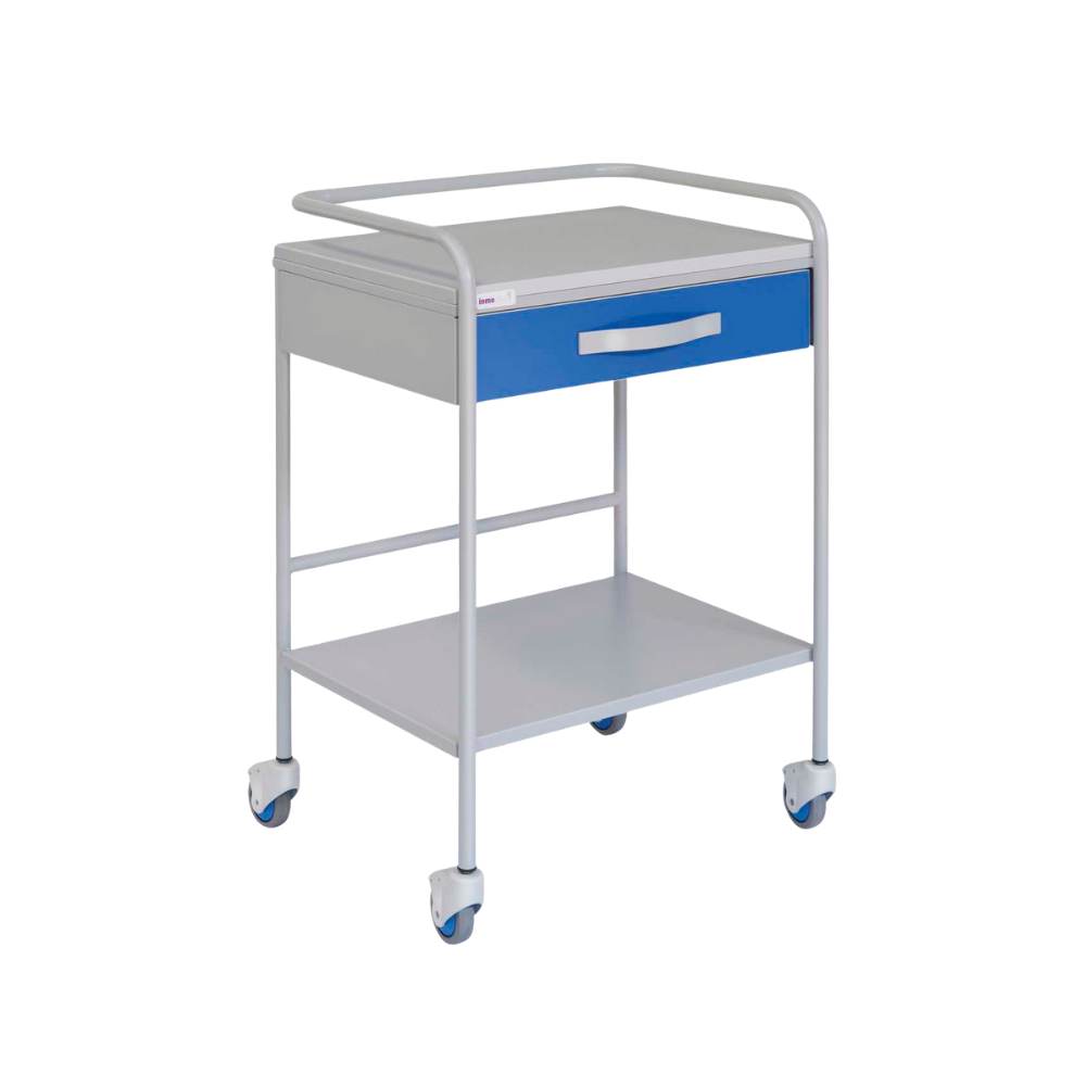 Mesa auxiliar para ECG – Funcionalidad, resistencia y diseño higiénico Estructura de acero con revestimiento epoxy, estantes con barandilla, cajón superior y frentes en HPL acabado brillo. Ideal para uso clínico en exploraciones de ECG.
