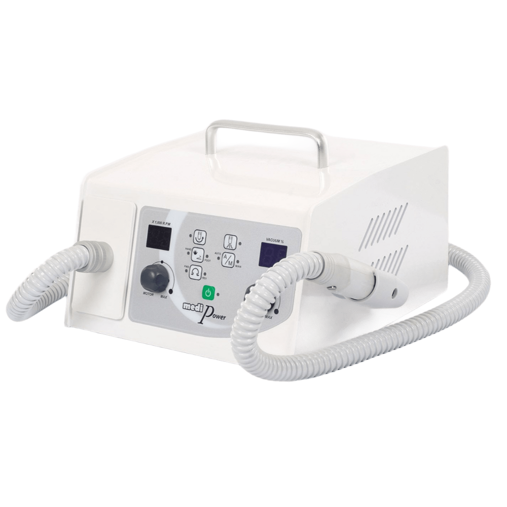 El Micromotor Medipower 30.000 es un torno profesional de la marca Saeshin ampliamente utilizado en podología y estética. Su característica más destacada es la integración de un sistema de aspiración de polvo en la pieza de mano, lo que mejora la higiene y la limpieza del área de trabajo.