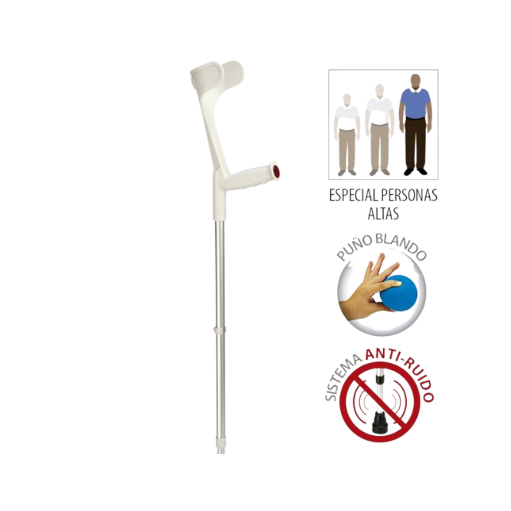 Muleta de aluminio extra larga – Confort y seguridad en cada paso Esta muleta de aluminio extra larga está diseñada para ofrecer una máxima estabilidad y comodidad al usuario. Fabricada con materiales resistentes y ligeros, permite un uso prolongado sin sacrificar el confort. Dispone de 9 posiciones de ajuste de altura, lo que la hace adaptable a distintas estaturas y necesidades. Su puño blando SOFT antibacteriano proporciona un agarre ergonómico y confortable, reduciendo la fatiga en manos y muñecas. Pensando en la seguridad, incorpora dos reflectantes (uno frontal y otro trasero) que mejoran la visibilidad en condiciones de poca luz. Además, su sistema antirruido integrado entre los tubos asegura una marcha silenciosa y fluida, ideal para uso diario tanto en interiores como en exteriores. Características destacadas: • Fabricada en aluminio de gran estabilidad • Altura ajustable en 9 posiciones • Puño blando SOFT con tratamiento antibacteriano • 2 reflectantes para mayor visibilidad y seguridad • Sistema antirruido para desplazamiento silencioso • Ligera, cómoda y fácil de manejar .