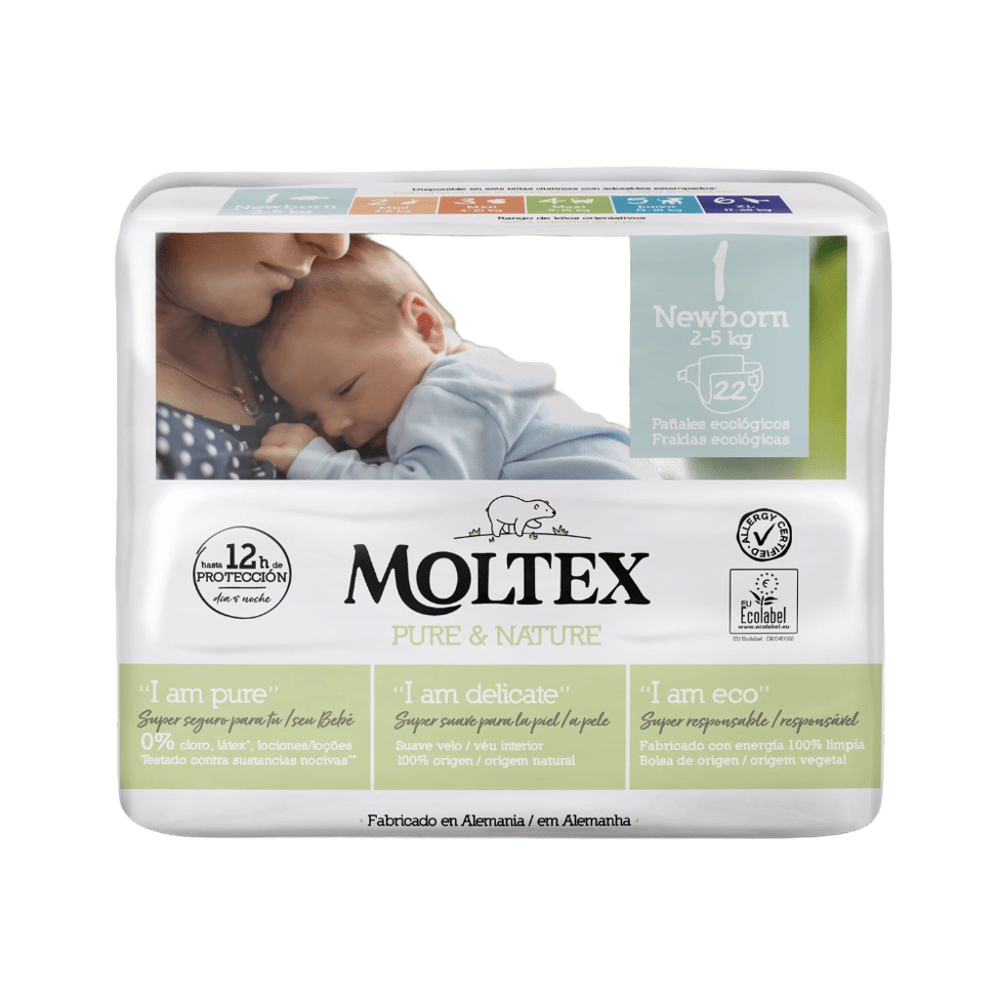 Moltex Premium Comfort Absorción: Prometen hasta 12 horas de protección y se secan hasta dos veces más rápido que los pañales anteriores de la marca. Ajuste y comodidad: Son ultraligeros y anatómicos para una mayor libertad de movimiento. Están fabricados con materiales suaves. Seguridad dermatológica: Han sido testados dermatológicamente. Moltex Pure & Nature Composición: La capa interior es de origen 100% natural, y la cubierta exterior contiene al menos un 15% de algodón orgánico super suave. Sin químicos: Están libres de químicos, como látex, y son suaves para la piel del bebé. Transpirabilidad: Son transpirables para ayudar a proteger la piel sensible. Variantes: También están disponibles en formato pants (pañales-braguita) ecológicos.