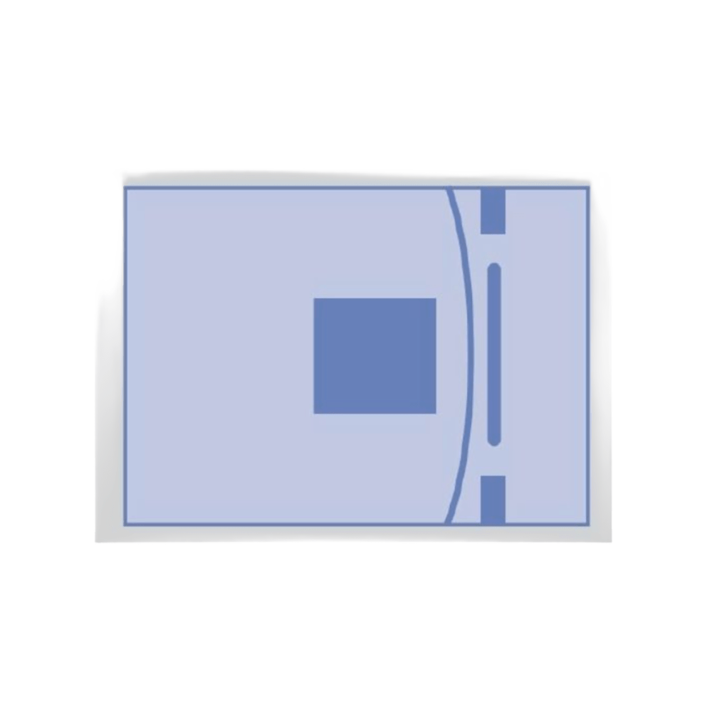 Paño-Bolsa para Oftalmología – Control y visibilidad en procedimientos oculares Paño quirúrgico de polietileno transparente mate con bolsa recolectora. Incluye fenestración de 13 x 10 cm con película de incisión y varilla maleable para apertura estable. Tamaño: 48 x 41 cm.