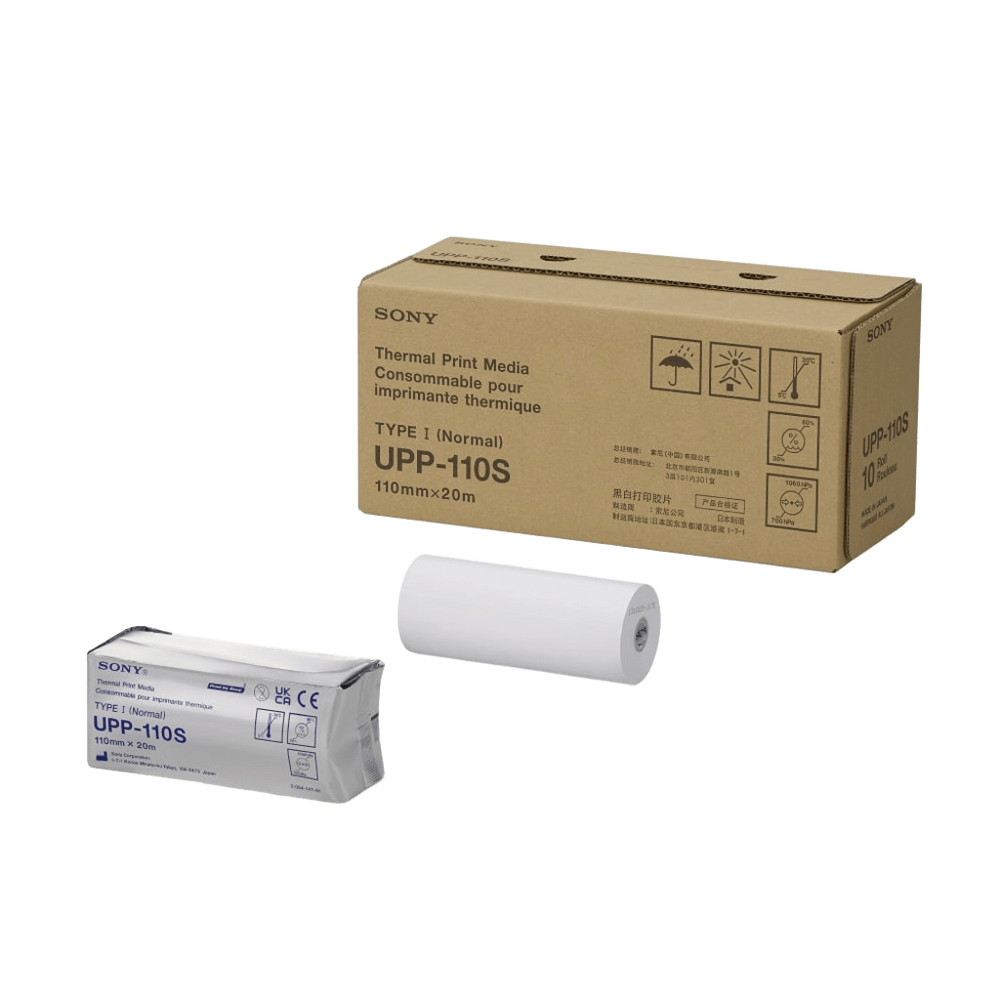 El papel ecógrafo en rollo Sony UPP-110S mide 110 mm de ancho por 20 metros de largo, y viene presentado en caja de 10 rollos. Es un papel térmico de alta calidad para impresión en blanco y negro, utilizado principalmente en aplicaciones de ultrasonido, odontología y microscopía.