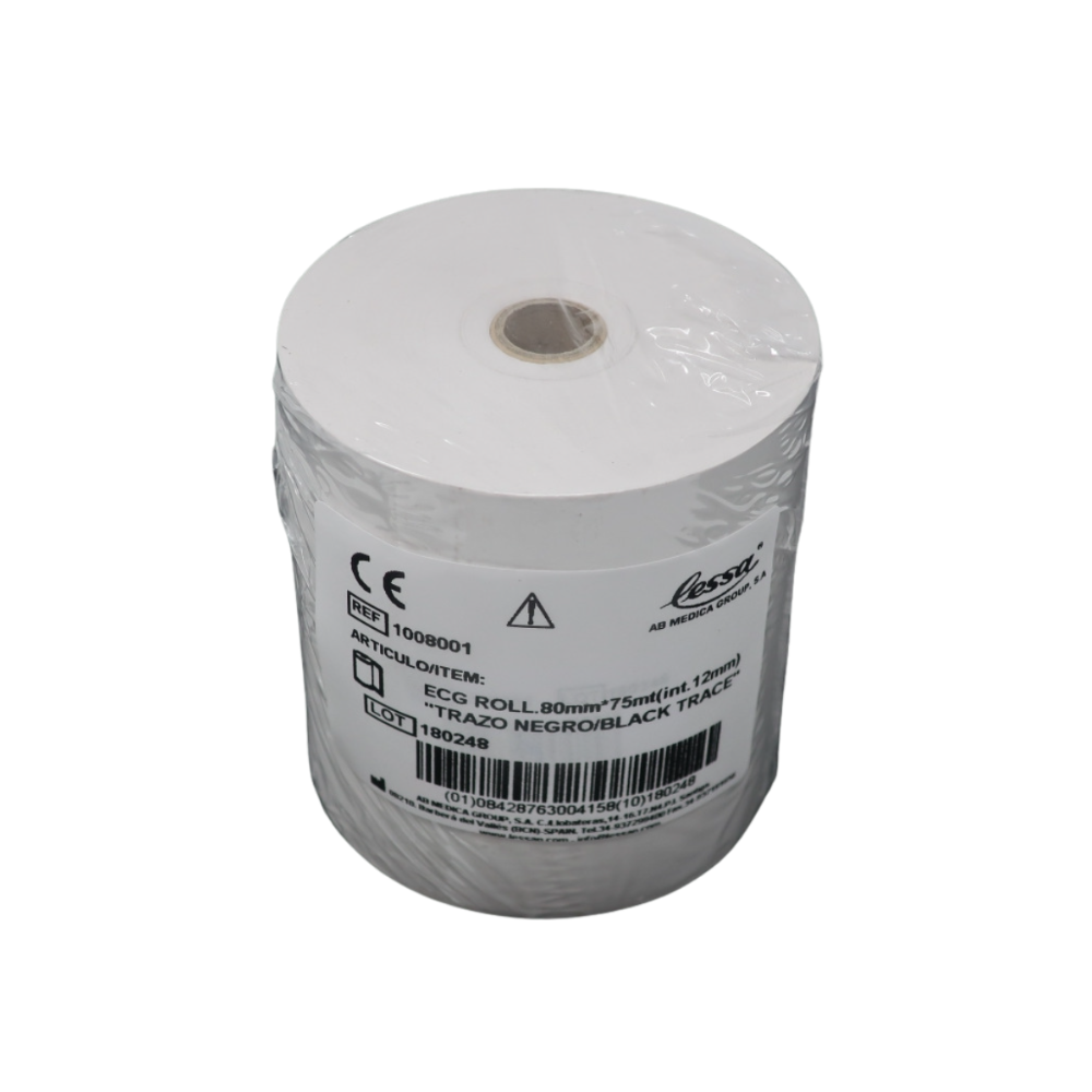 Papel en Rollo Térmico – 80 mm x 75 m Rollo de papel térmico de alta calidad para ECG, espirometrías y pruebas de esfuerzo. Compatible con equipos de impresión térmica por cabezal.