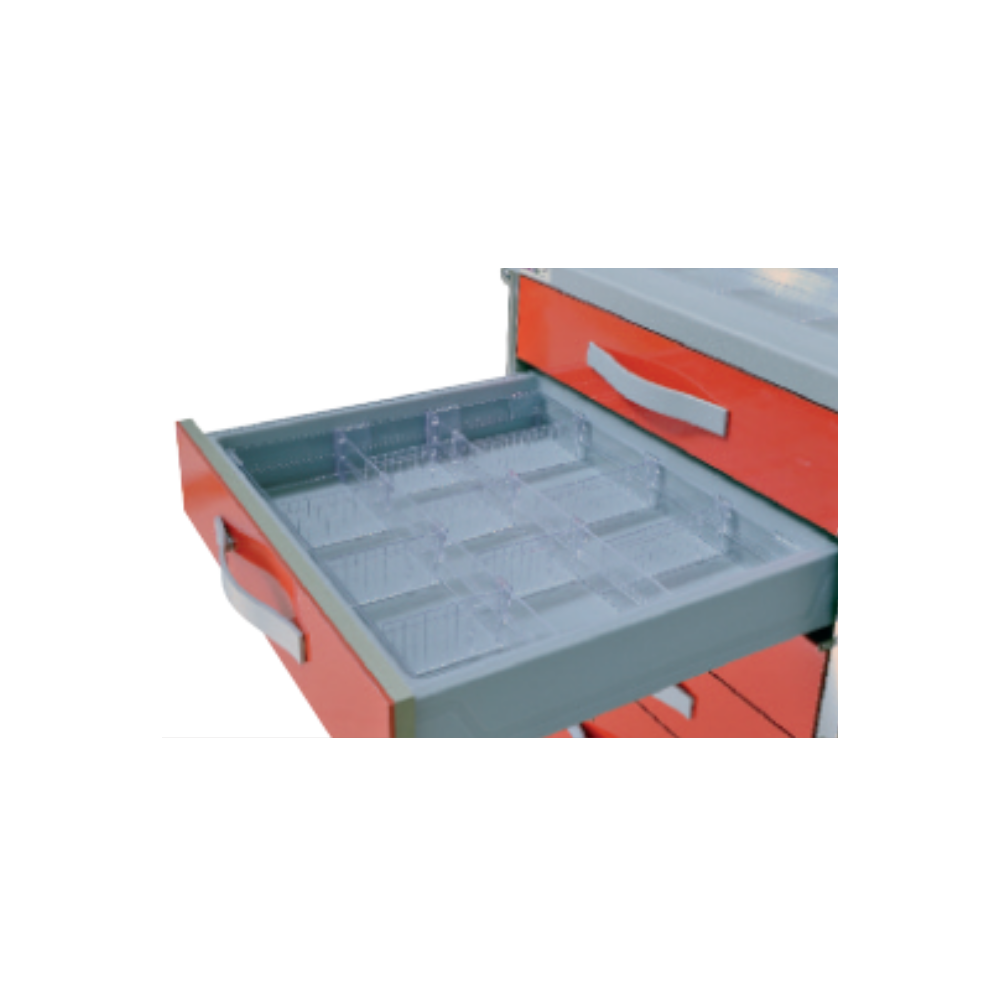 Separación 18 compartimentos para carro hospitalario. Separador interior modular para cajones/cestas en carros hospitalarios, con 18 compartimentos ajustables. Permite organizar de forma óptima el interior del carro, adaptándose a distintos tamaños de material. Compatible con carros Inmoclinc.