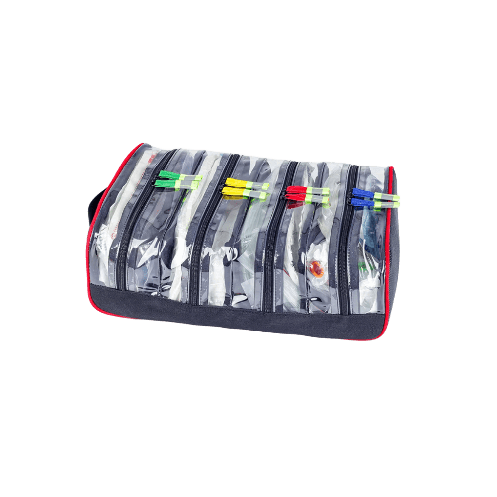 Set de 4 Compartimentos de Colores – Organización rápida por especialidad Bolsas interiores con frontal transparente y tiradores reflectantes. Código de colores internacional para respiración, circulación, cirugía y pediatría.
