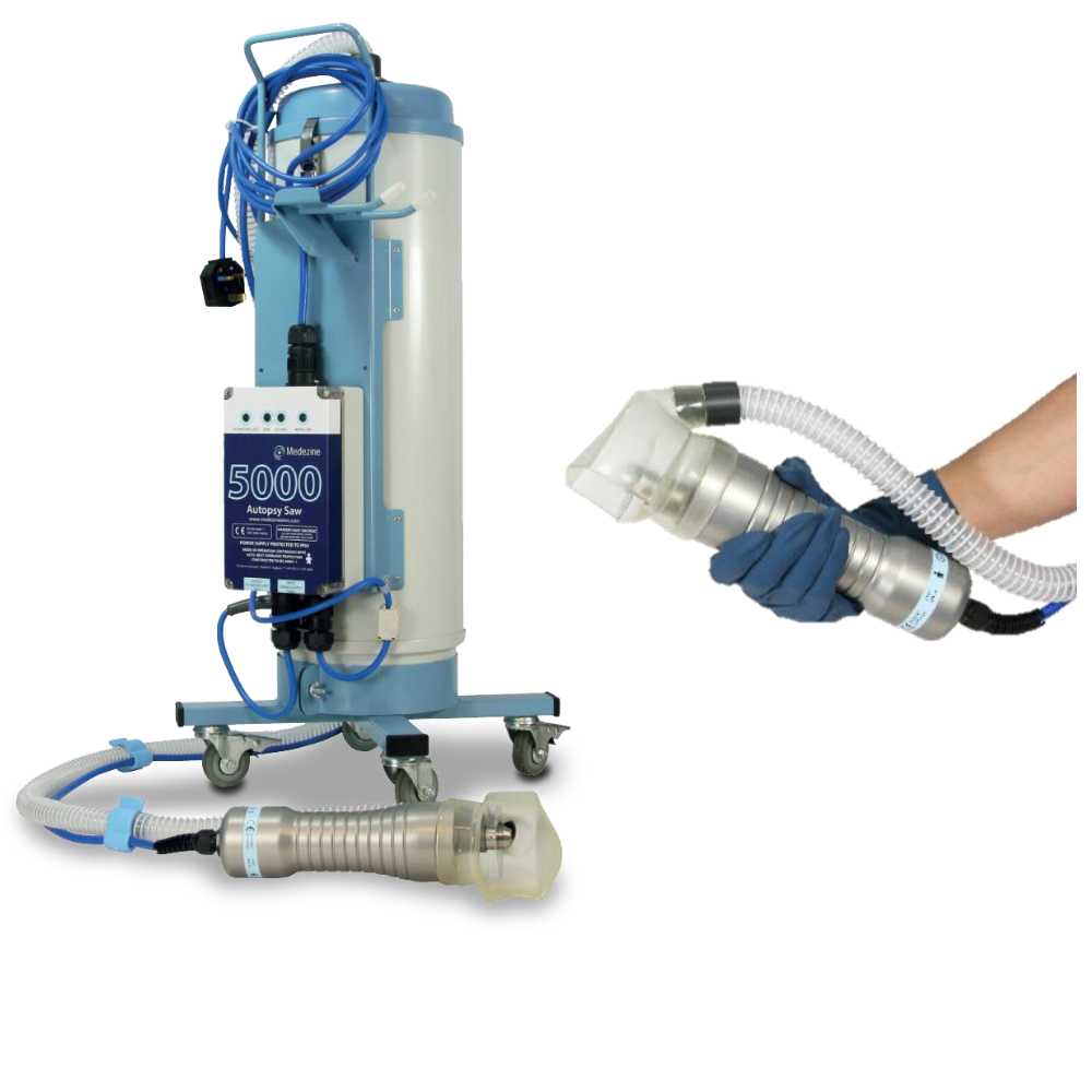 Sierra manual de autopsia con aspiración Equipo portátil con sistema de aspiración de partículas. Ergonómica, sumergible para limpieza y de alta potencia.