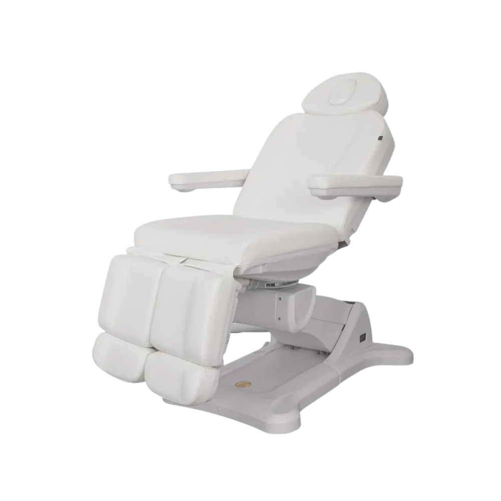 Sillón de podología de alta gama – Rotación 240° y control total de movimientos Sillón eléctrico con 3 motores, rotación de 240°, reposapiés ajustables, reposabrazos abatibles y función RST. Tapizado en PU blanco. Medidas: 136 x 82 x 64 cm.