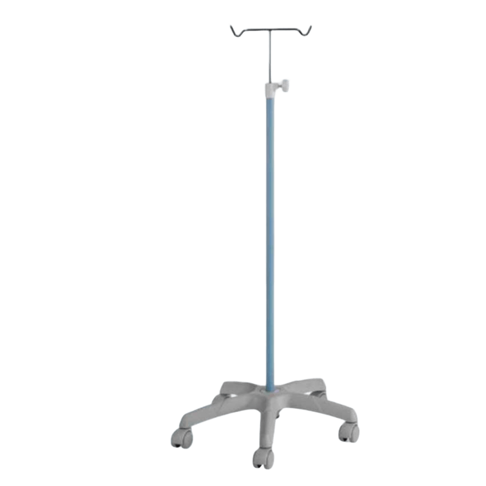 Soporte Portasuero de Acero Inoxidable con 2 Colgadores Este soporte portasuero está diseñado para brindar funcionalidad y estabilidad en ambientes médicos y hospitalarios. Su estructura está fabricada en acero esmaltado de color azul, combinando resistencia y durabilidad, mientras que la base es de PVC, lo que garantiza ligereza y seguridad. Cuenta con dos colgadores para sueros, ofreciendo soporte adecuado para equipos médicos. La regulación de altura es manual, utilizando un volante de fijación para ajustar la posición según las necesidades del paciente. Su peana de 560 mm de diámetro, con cinco patas, proporciona una base firme y equilibrada, mientras que las cinco ruedas pivotantes de Ø50 mm facilitan el desplazamiento fluido y seguro. Este soporte portasuero es ideal para hospitales, clínicas y otros espacios médicos donde se requiera comodidad y versatilidad. Características principales: • Estructura en acero esmaltado azul. • Base de PVC. • Dos colgadores para suero. • Regulación de altura manual mediante volante de fijación. • Peana de 560 mm de diámetro con cinco patas. • Cinco ruedas pivotantes de Ø50 mm. .