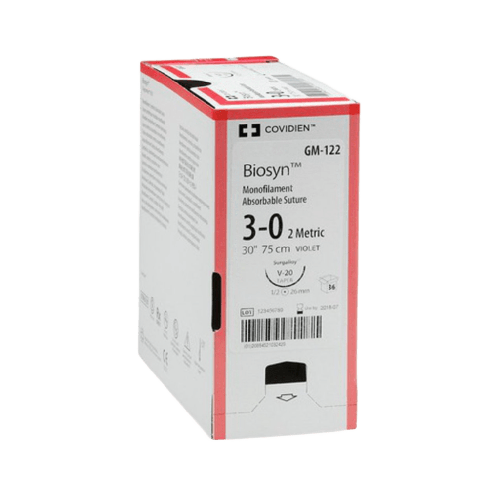 Biosyn™ – Sutura Sintética Absorbible Monofilar de Glycomer™ 631 Absorción Media Descripción del producto: Biosyn™ es una sutura sintética absorbible monofilamento elaborada a partir de Glycomer™ 631, un copolímero compuesto por glicólido (60%), carbonato de trimetileno (26%) y dioxanona (14%). Diseñada para ofrecer una absorción media, Biosyn™ combina una resistencia mecánica adecuada durante el período crítico de cicatrización con una excelente manejabilidad y mínima reacción tisular. Disponible en color violeta para mayor visibilidad durante la intervención quirúrgica o en versión incolora (natural), se adapta a múltiples necesidades clínicas. Características principales: • Excelente resistencia inicial y mantenimiento in vivo durante la fase crítica de cicatrización. • Seguridad confiable en el anudado. • Monofilamento con bajo efecto memoria que facilita su manejo. • Mínima reacción tisular gracias a su composición sintética biocompatible. • Absorción por hidrólisis completa entre 90 y 110 días. • Disponible en diferentes calibres y presentaciones para una amplia gama de procedimientos quirúrgicos. .