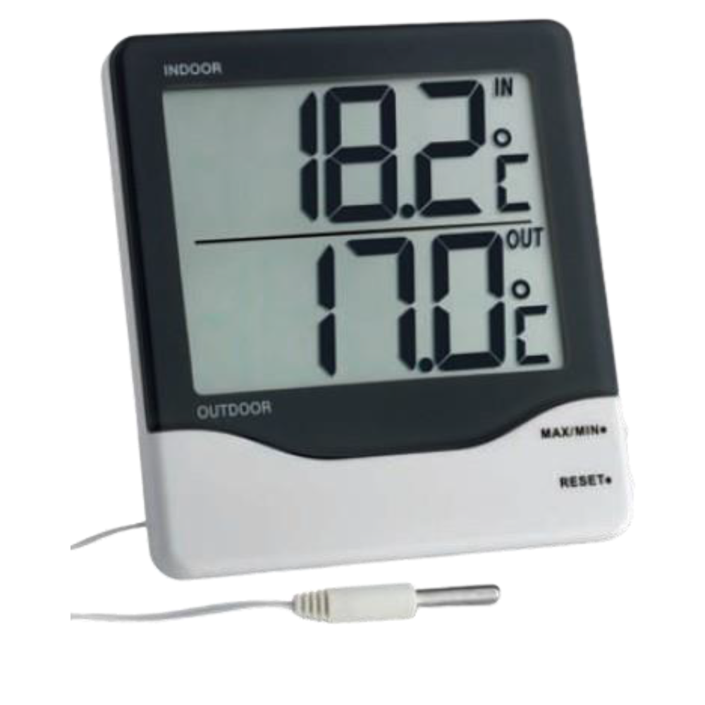 Termómetro Máxima - Mínima Digital Con Sonda Termómetro digital con sonda externa de 1,5 m, pantalla grande y memoria para temperaturas máximas y mínimas. Ideal para uso interior y exterior.
